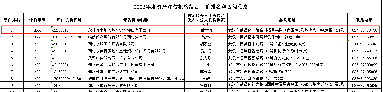 2024年9月9日,湖北省资产评估协会发布2023年度湖北省资产评估机构综合评价榜单,永业行凭借卓越的服务质量和执业水平,荣膺“AAA级资产评估机构”,位列湖北第一。